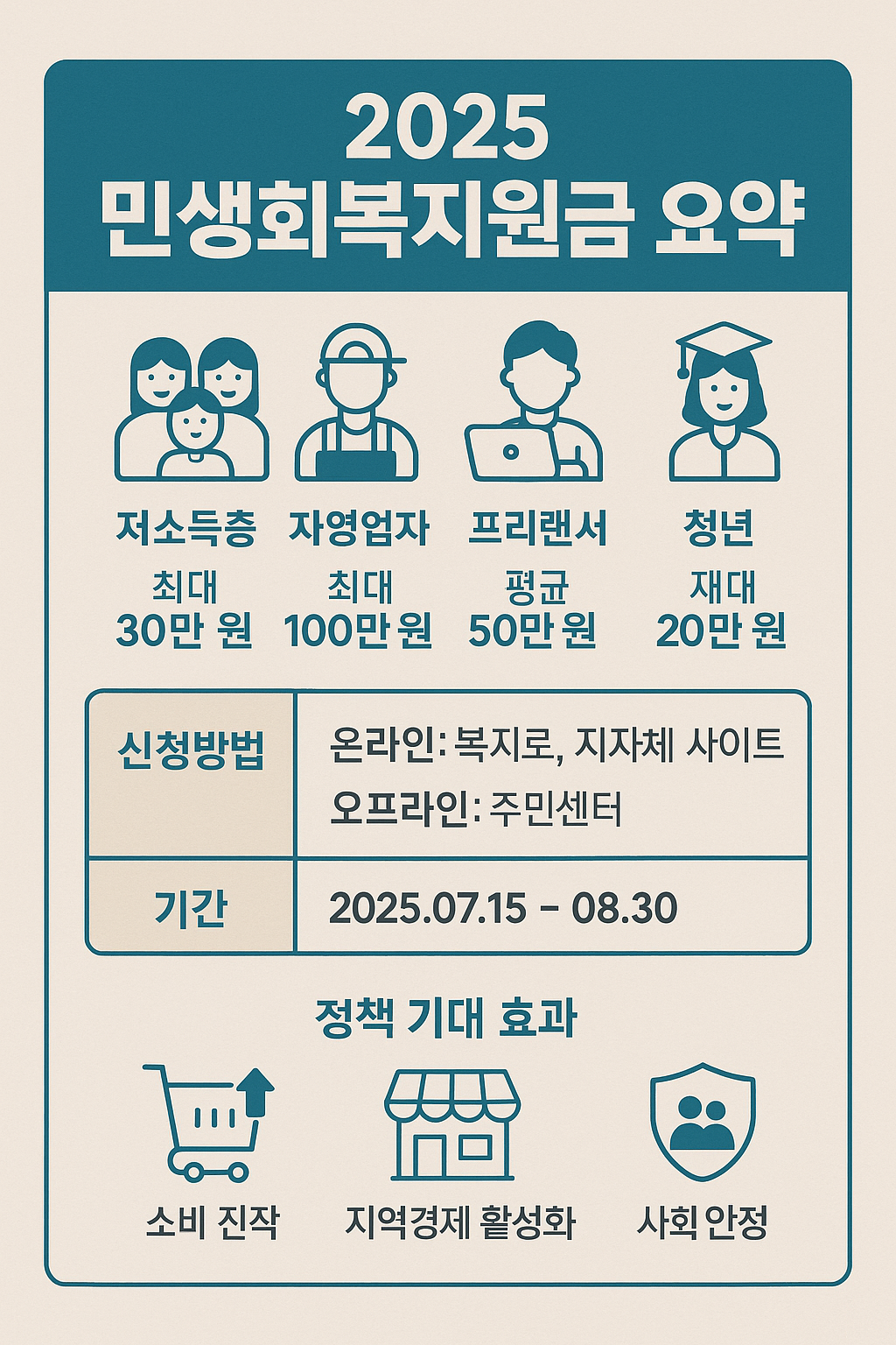 - 기초생활수급자: 총 40만원 (기본 15만원 + 추가 25만원)