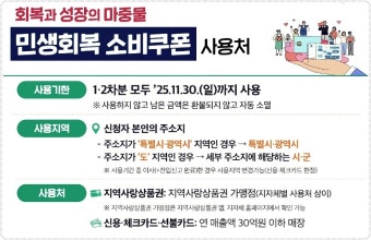 | 사용 기한 (2025년 11월 30일) | 단기간 내 소비 유도, 내수 진작 효과 극대화 | 기한 내에 다 못 쓰면 어떻게 되나요? | 기한 내 사용하지 않은 잔액은 자동 소멸되니, 계획적으로 사용하여 아깝게 사라지는 일이 없도록 주의해야 합니다. |